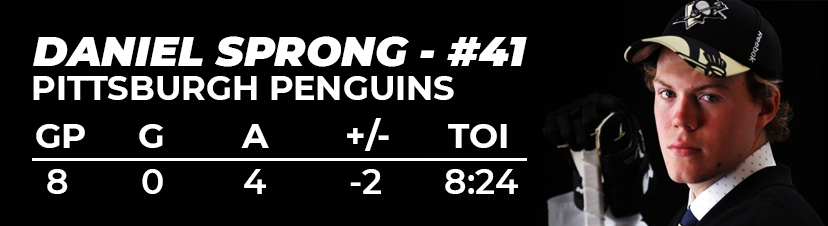 Van de negen duels die Pittsburgh inmiddels heeft afgewerkt, heeft Sprong er in acht meegespeeld. En gemiddeld genomen zit er nog steeds een neerwaartse lijn in de speelminuten van de Nederlander. Gemiddeld krijgt hij nu 8:24 per wedstrijd. Allesbehalve ideaal voor een jonge speler als Sprong. De teller voor goals blijft nog steeds op 0 staan, maar bij de assists kunnen we er weer een bijschrijven. De plus-minus blijft ook nu weer gelijk: -2.