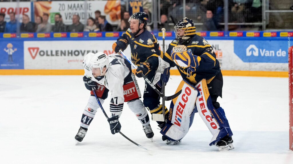 Het begin goed in de laatste periode. Want Giovanni Vogelaar, kon na een straf van James Bettauer voor holding, met zijn befaamde schot vanaf de blauwe lijn de 2-4 scoren in de eerste minuut van de derde periode. Maar uiteindelijk mocht het niet baten voor Tilburg want vier minuten voor tijd scoorde Tomas Rubes de empty netter zodat Blue Devils Weiden nog maar een overwinning nodig heeft om de finale te behalen. Zowel Diego Hofland als anvoerder Max Hermens lieten na afloop weten zondag alles te geven om nog een game zes af te dwingen dinsdag op Stappegoor. Maar de mannen van Weiden lieten juist weten dat ze geen game zes wilden en juist de extra rust op weg naar de finale willen pakken. Kan nog een mooie clash worden game vijf in Weiden zondag 7 april.