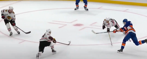 Dobson (in het blauw) knalt de puck in het Blackhawks doel Foto: Still YouTube