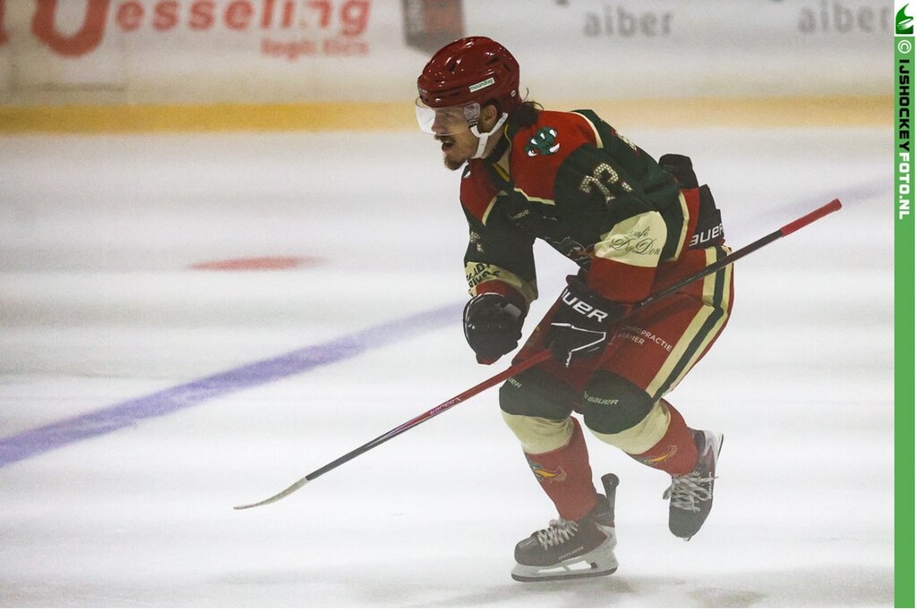 Hunter Fortin na een treffer voor de Dragons Foto: Paul Nicolaassen/IJshockeyfoto.nl