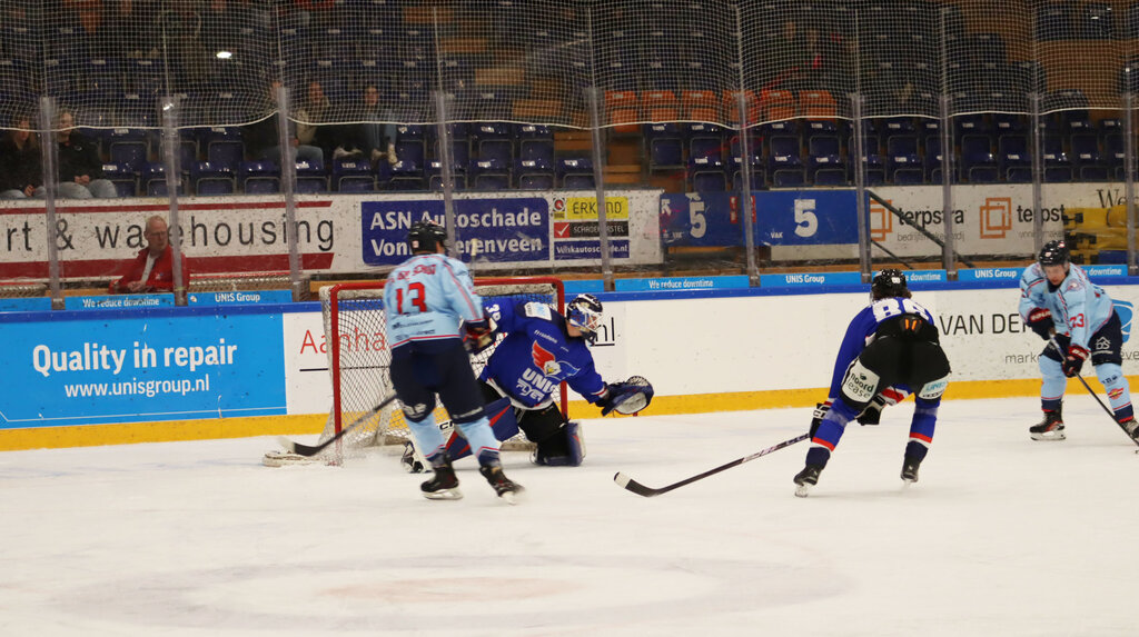 Parlind Berisha en Oosterveld leverde nog even adressen uit voor de kerstkaarten aan het eind van de eerste periode. En Viktor Nordemann mocht met nog 39 seconden te gaan ook naar de strafbank voor interference. En die straf werd duur betaald want met nog zo’n tien seconden te gaan op de powerplay aan het begin van de tweede periode sloeg HIJS Hokij voor de derde keer toe. Tussen de twee face-offs cirkels schoot Matthieu Desaultes binnen via goalie Kivits. Halverwege de wedstrijd was het Raymond van der Schuit die de vierde treffer voor Den Haag maakte. Mustonen vond haast op de doellijn staand de startende van der Schuit op snelheid met een splijtende cross-pass en stuurde hem zo een op een met goalie Kivits.