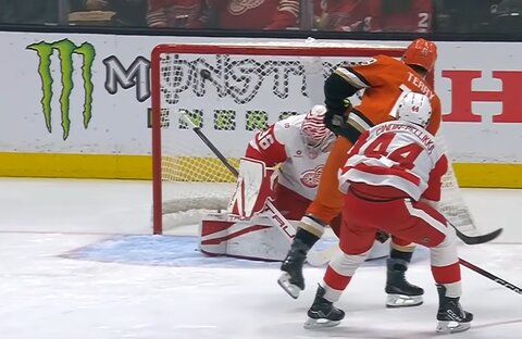 De terroreenden trokken de Red Wings het vel over de oren ondanks het onsportieve gedrag van hun ex-goalie John Gibson (27 saves, 0.871%). Die dacht bij een 3-2 achterstand in minuut 41 slim te zijn door zijn eigen doel bewust los te beuken en zo de 4-2 te voorkomen. Dat werd na videoreview ontdekt en dus telde de vierde treffer van Anaheim gewoon. Terroreend number one Troy Terry (2G, 1A) schoof in minuut 58 de vijfde en laatste Anaheim-goal in het verlaten Red Wings-net: 5-2. Einde verhaal voor Detroit. Ducks-goalie Lukas Dostal (28 saves, 0.933%) keepte zonder bedrog een fraaie match.