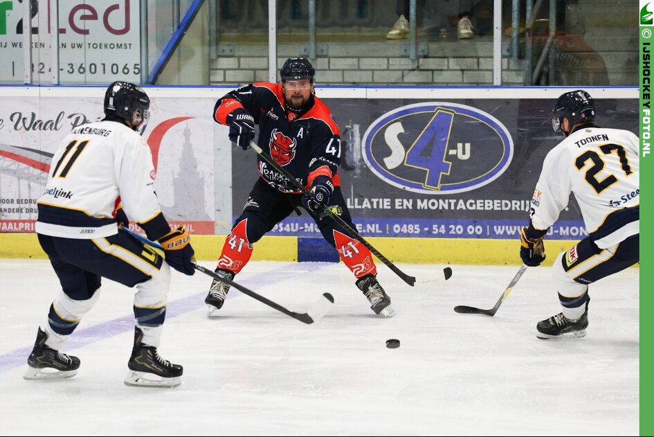 Gisteravond verslikten de forwards van de Nijmegen Devils zich bijna in de Zoetermeer Panters. De sensationeel goede doelman Hugo Bränn (47 saves, 0.940%) was heer en meester en hield de Devils-forwards in periode één op schitterende wijze in bedwang. De laatste veertig minuten verloor Nijmegen enigszins de grip op de wedstrijd maar stapte het toch met de volle buit van het ijs. Met een magere 3-2 zege werd Zoetermeer voor de derde keer dit seizoen met lege handen naar huis gestuurd.