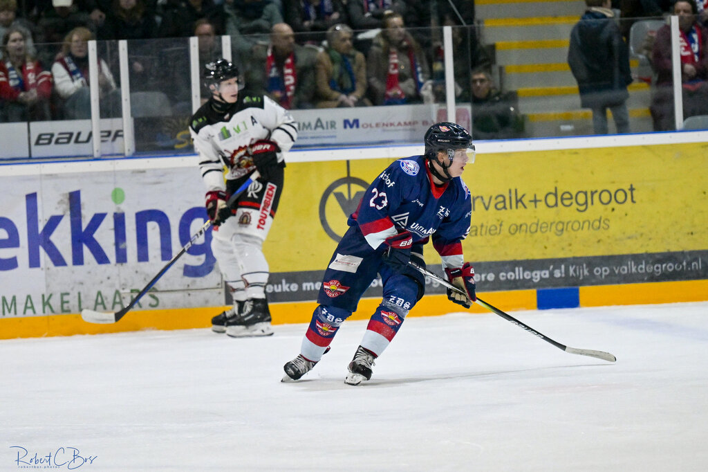 Met nog negen minuten te gaan werd het even stil in de Uithof want op de breakaway met 3-tegen-2 zorgde Gyesbreghs met een strak schot na een mooie assist van Dries Blockx voor de 4-5. Coach Postma haalde met nog twee minuten te spelen goalie Mario Culina naar de kant en dat betaalde zich uit. Jay Huisman gaf een backhander richting de goal, waar Cody Monds de puck oppikte goalie Raeymaekers omspeelde en de puck in het net deed belanden voor de 5-5.
