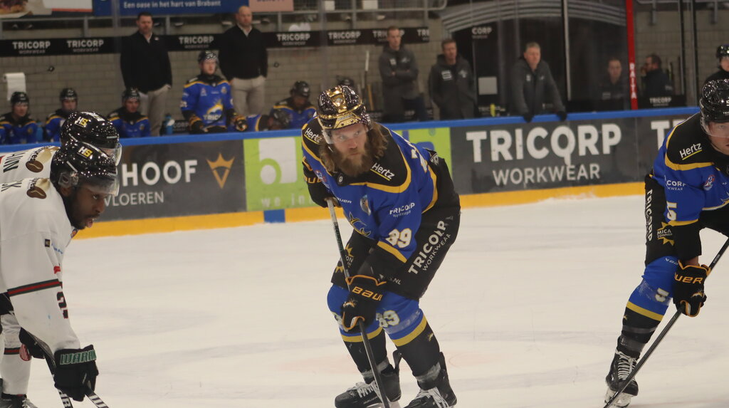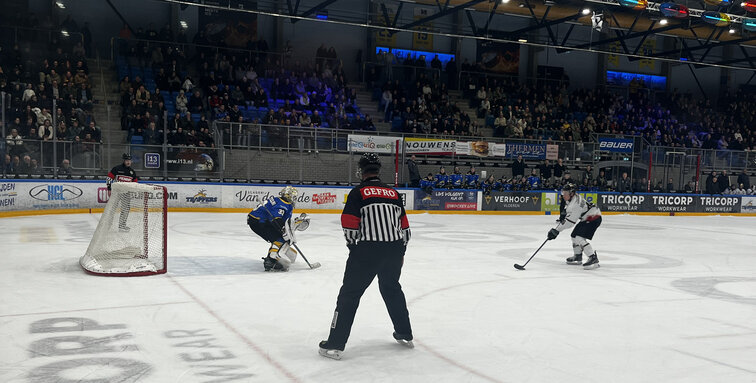 De voortekenen waren niet gunstig gisteren in het IJssportcentrum Tilburg. Een aantal mensen op de tribune die niet op de socials van Tilburg hadden gekeken zagen de Nijmegense viking Mike Dalhuisen met de gouden helm zijn entree maken op het ijs voor de warming-up.