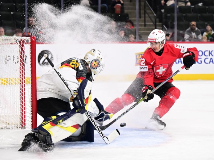 Zwitserland heeft zich met een overtuigende 4-0 overwinning op Duitsland geplaatst voor de kwartfinales van het WK. Kimi Koerbler (nog niet gedraft) was de grote man met twee goals. Terwijl goalie Christian Kirsch (nog niet gedraft) met twintig reddingen zijn eerste shut-out op het WK noteerde. De Zwitsers domineerden vanaf de openingsface-off en kwamen halverwege de eerste periode op voorsprong. Verdediger Gian Meier (nog niet gedraft) vond Koerbler voor het doel, die knap afrondde. Op de powerplay verdubbelde Zwitserland de marge via Jamiro Reber (nog niet gedraft), na een slimme assist van captain Leon Muggli (Washington Capitals, 2023).