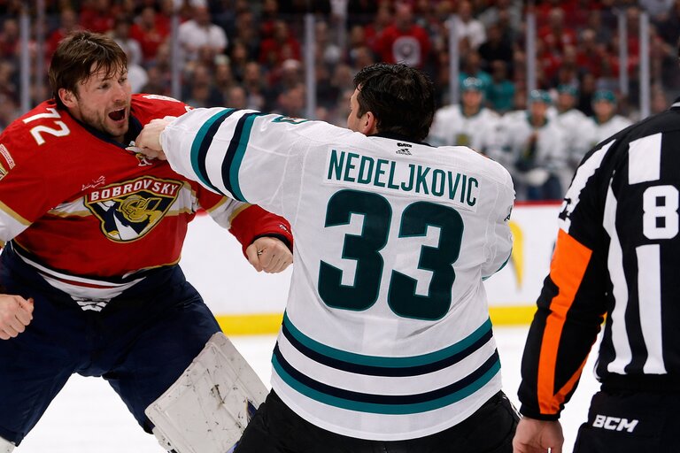 Florida vierde de terugkeer van Matthew Tkatchuk maar het leverde geen punten op. Tegen de Sharks konden de Panthers geen vuist maken. Goalie Alex Nedeljkovic stopte 35 schoten 0,972% en sloeg Sergei Bobrovsky (24 saves, 0,889%) tegen het ijs in de goalie fight.