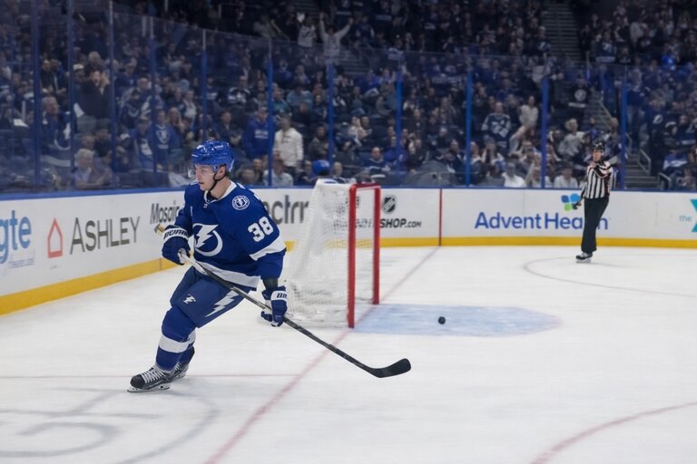 Brandon Hagel van Tampa heeft inmiddels een veertien games point streak. In deze wedstrijd was hij goed voor twee goals en een assist.