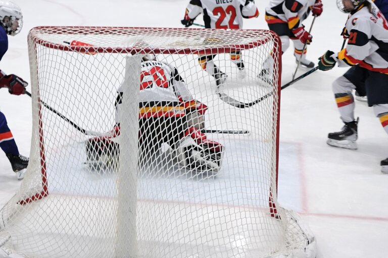 De beste Belgische speelster vandaag tegen IJsland Eurydice Blairon met 35 saves Foto: IIHF.tv enhanced with AI