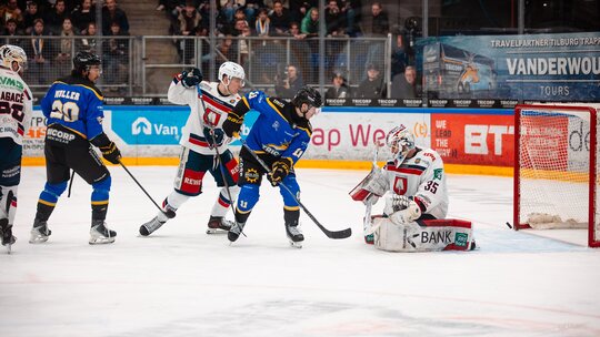 De thuisploeg begon geconcentreerd en liet de puck snel rondgaan. Hoewel Hannover in de openingsfase iets meer schoten noteerde, nam Tilburg gaandeweg het initiatief over. Halverwege de eerste periode volgde de verdiende openingstreffer: Noah Muller rondde af na een strakke pass van Kilian van Gorp met een hard afstandsschot in de winkelhaak.