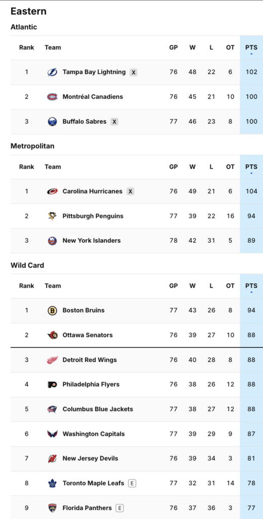 Speeldag 160 in de NHL maakte het weer heel spannend in de strijd om de wild cards en een afvaller voor de play-offs. Dubbele kampioen van de afgelopen twee jaren de Florida Panthers kunnen na het pak slaag in Pittsburgh de golfballen alvast oppoetsen. Buffalo en Tampa zijn inmiddels officieel zeker van de play-offs.